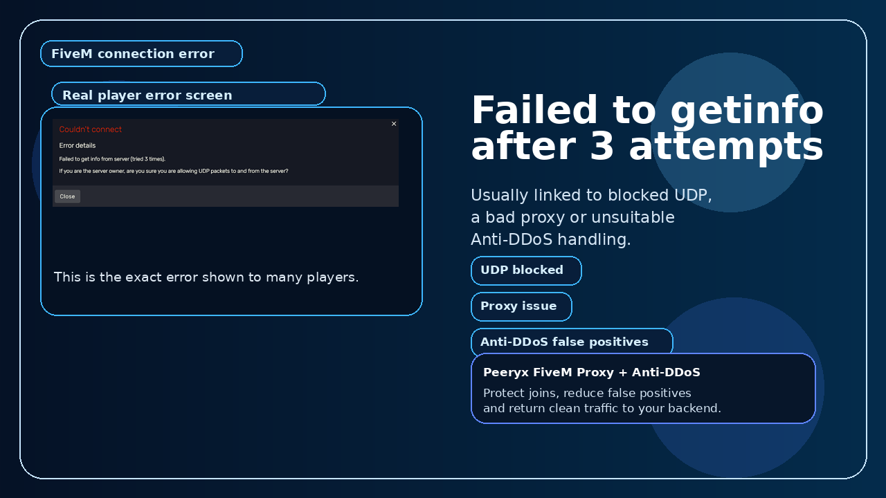 In FiveM weisen “Failed to getinfo after 3 attempts” und “Fetching info from server” oft auf dasselbe Problem hin: Die Join-Phase wird durch blockiertes UDP, einen falschen Proxy, ungeeigneten Anti-DDoS-Schutz oder einen begrenzten Hoster gestört. So diagnostizieren Sie es und darum hilft Peeryx FiveM Reverse Proxy Anti-DDoS.