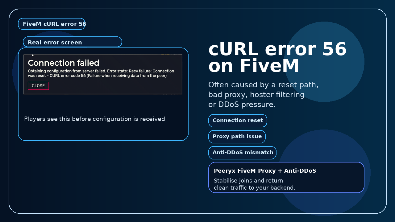 Cet article cible la requête “fivem curl error 56” pour aider les administrateurs FiveM à faire la différence entre un souci ponctuel et un vrai problème d’infrastructure. Le but est aussi clair : si votre serveur attire du trafic public, une protection Anti-DDoS FiveM via Reverse Proxy Peeryx peut éviter que ce type d’incident devienne récurrent.
